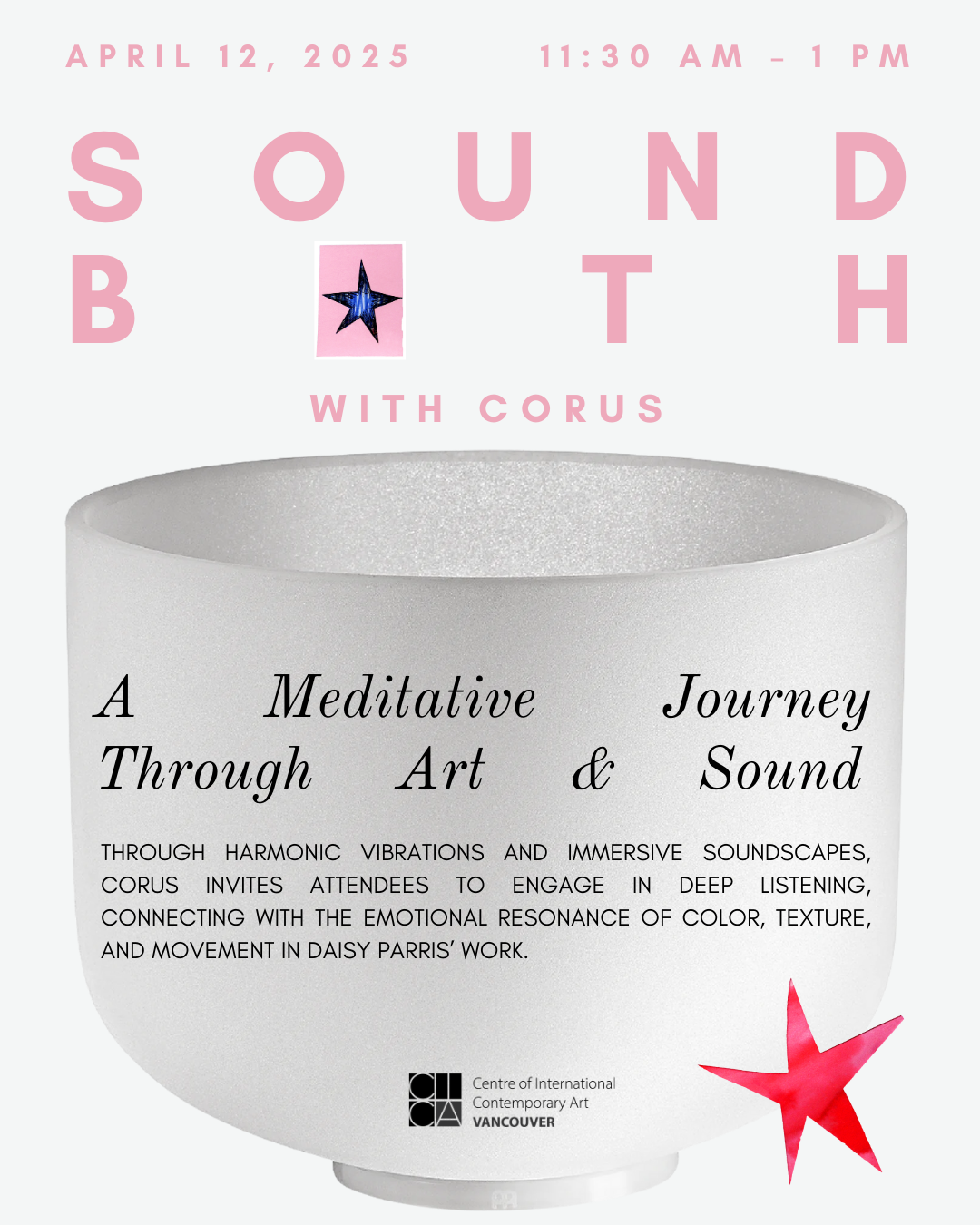 As part of CICA Vancouver’s exhibition Clouds for Breakfast by Daisy Parris, we are hosting a special sound bath meditation session facilitated by Corus, a X̄á’isla & Kitasoo Xai’xais sound artist. This event will create an immersive and contemplative space where sound and contemporary abstract art converge, offering participants a deep sensory experience of Parris’ work.