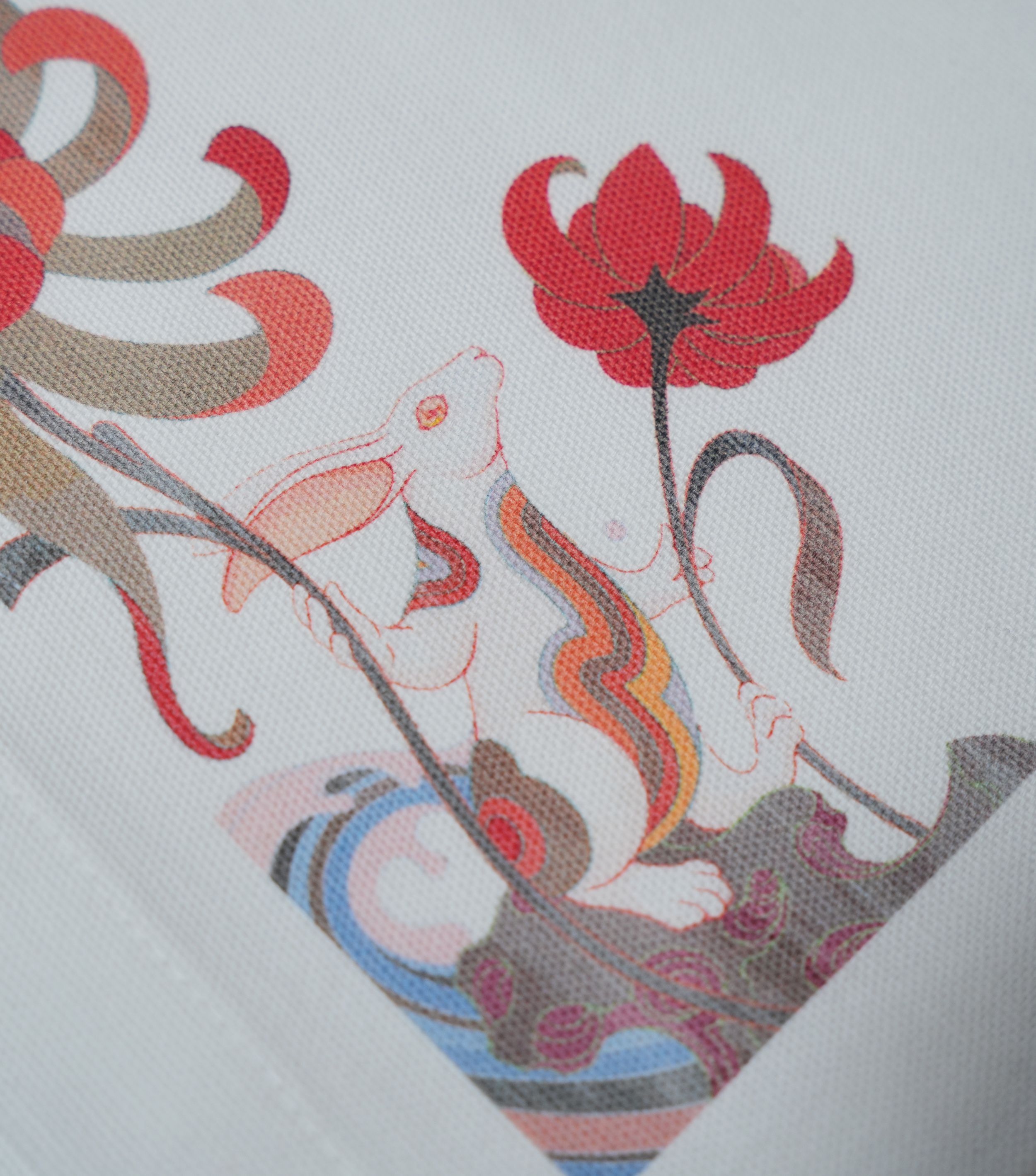 Locally sourced and printed in east Vancouver, the Meadowlark Napkin features a melodious snippet from James Jean’s large-scale painting, Bear (2023). A rabbit sage stares upward as it balances itself while holding onto a mystical chrysanthemum, a delicate flower native to China representing the earth and Eastern mindset of connection and community.